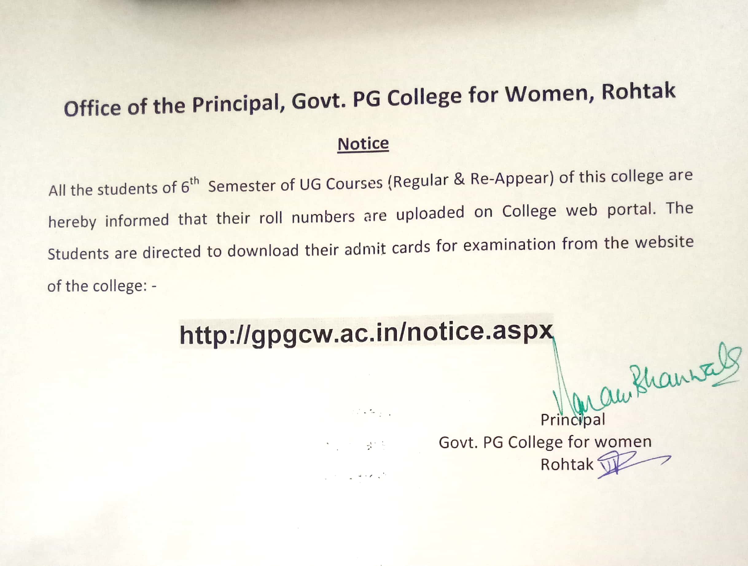 OFFICE OF THE PRINCIPAL, GOVT. P.G.COLLEGE FOR WOMEN, ROHTAK Notice All t...